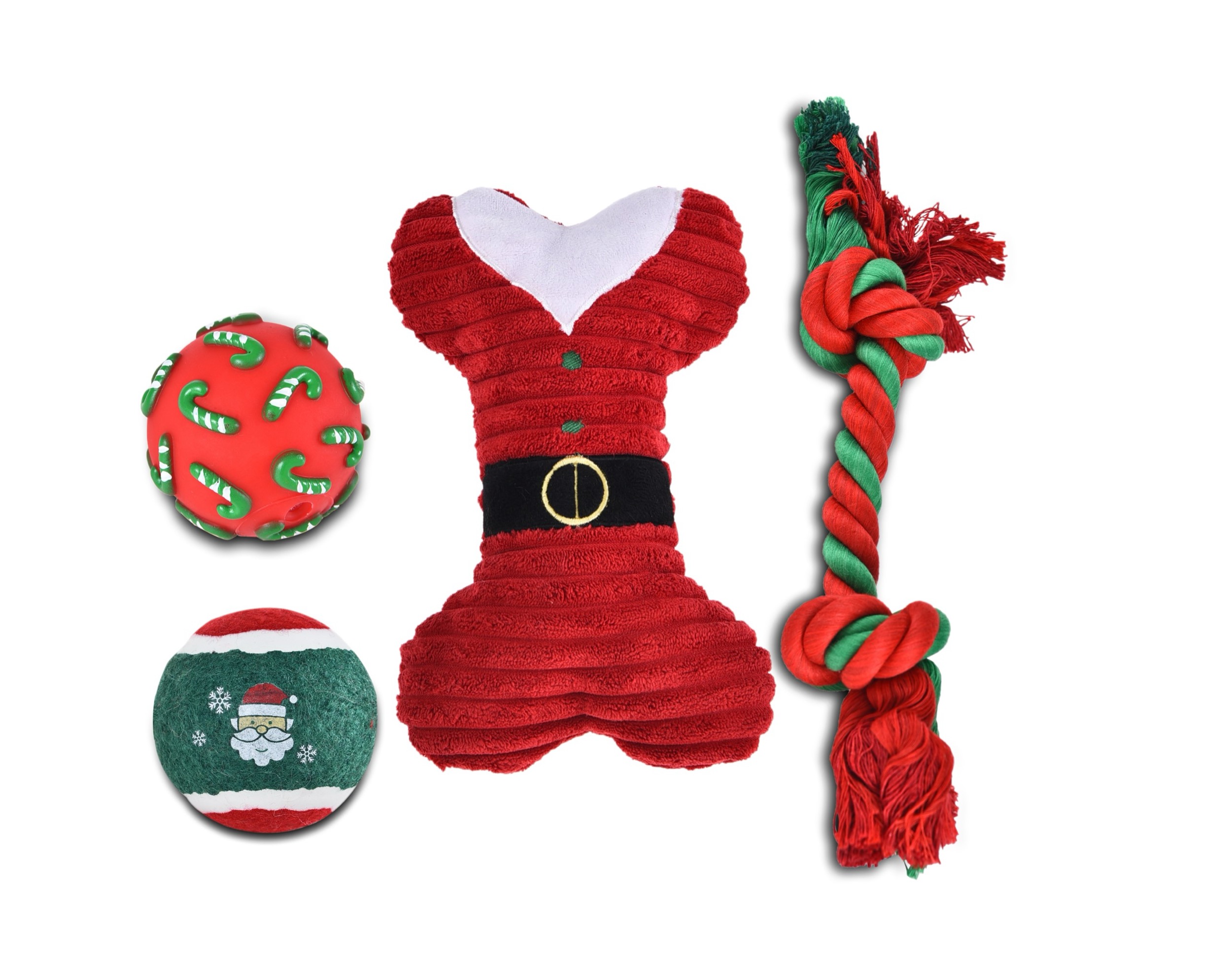 Jõuluteemaline punane mänguasjakomplekt koertele.