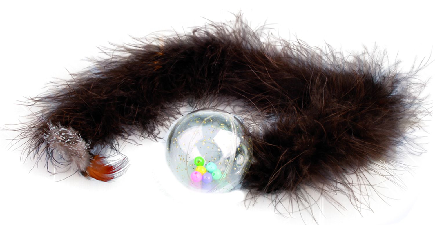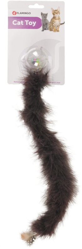 Flamingo kassi mänguasi kõrisev pall pehme boa sabaga, mille otsas on linnu sulg.