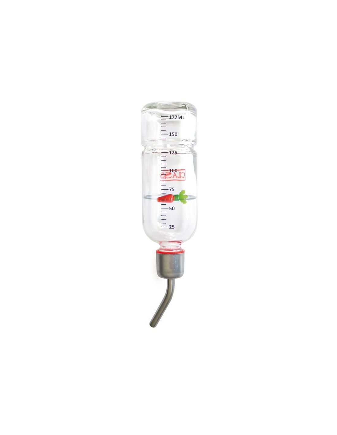 Klaasist joogipudel närilistele ja jänestele, lekkekindla süsteemiga, puurikonksude ja väikese plastikust porgandiga veetaseme märkimiseks pudeli sees.