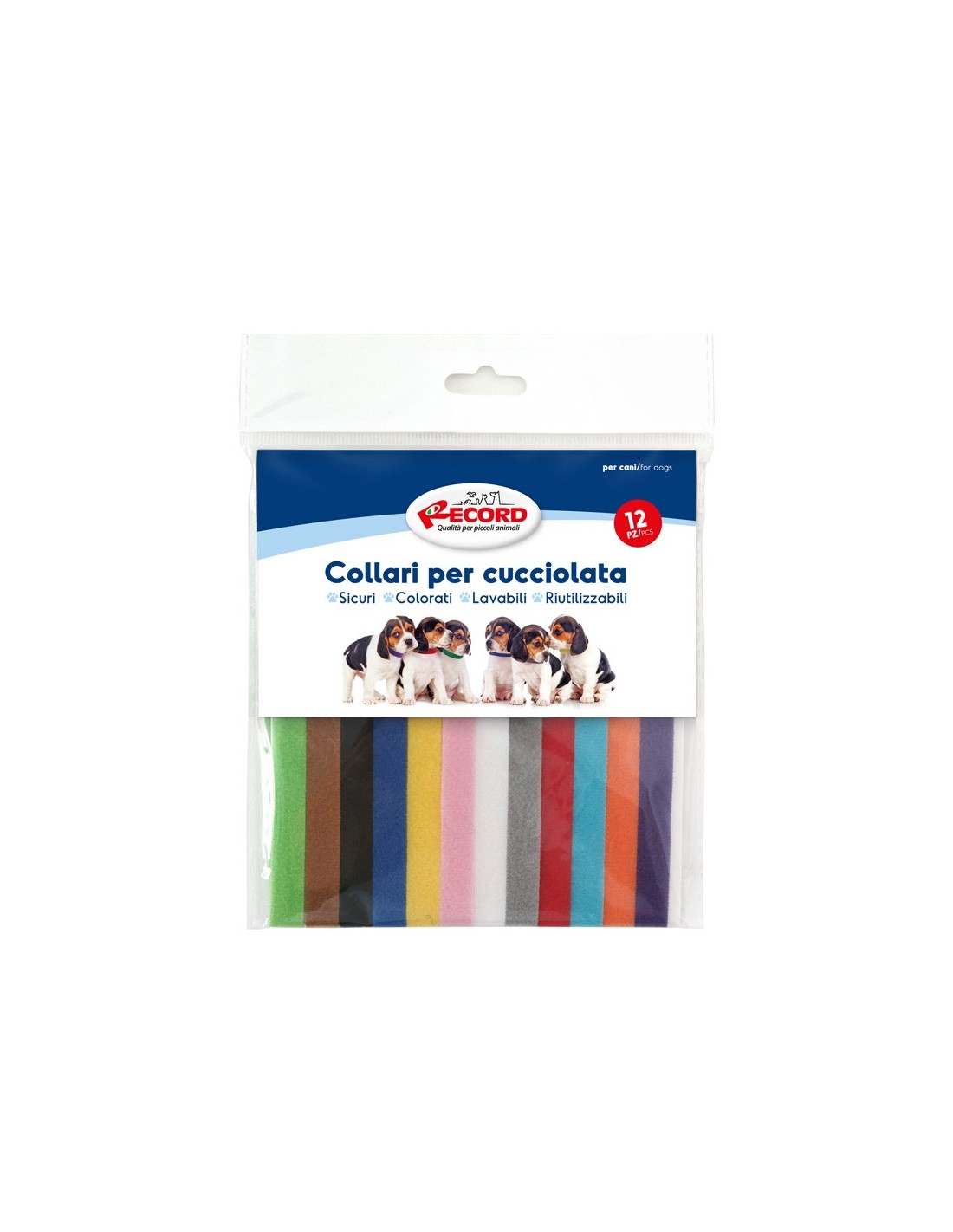 Record 12-st kaelarihmast koosnev komplekt koertele, praktilise Velcro-kinnitusega, mis kohandub looma kaela suurusega ja hoiab ära naha ning karva ärrituse.